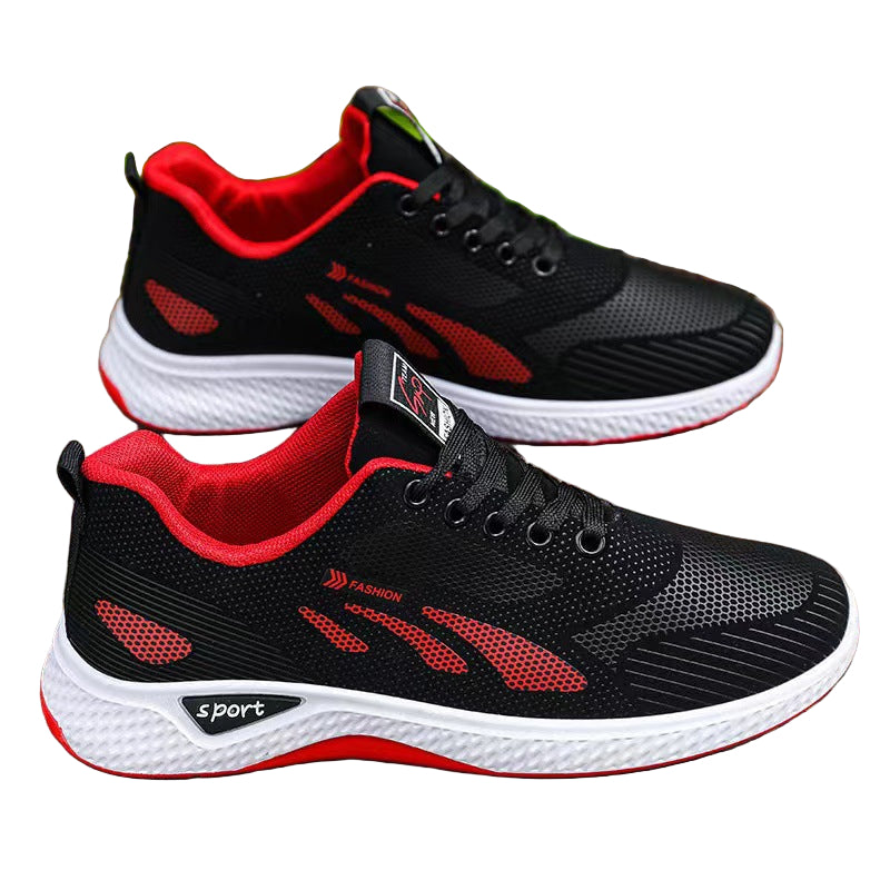 These men's sports shoes in black with red or grey accents combine functionality and style for daily wear. Crafted with breathable mesh uppers and soft PVC soles, they offer comfort and durability. The low-cut design and front tie strap ensure a secure fit, while the round toe shape provides ample room for movement. Featuring waterproof and anti-slip properties, they are ideal for spring and summer activities, including running and casual outings. these versatile shoes are made for men seeking reliable, trendy footwear that supports an active lifestyle.