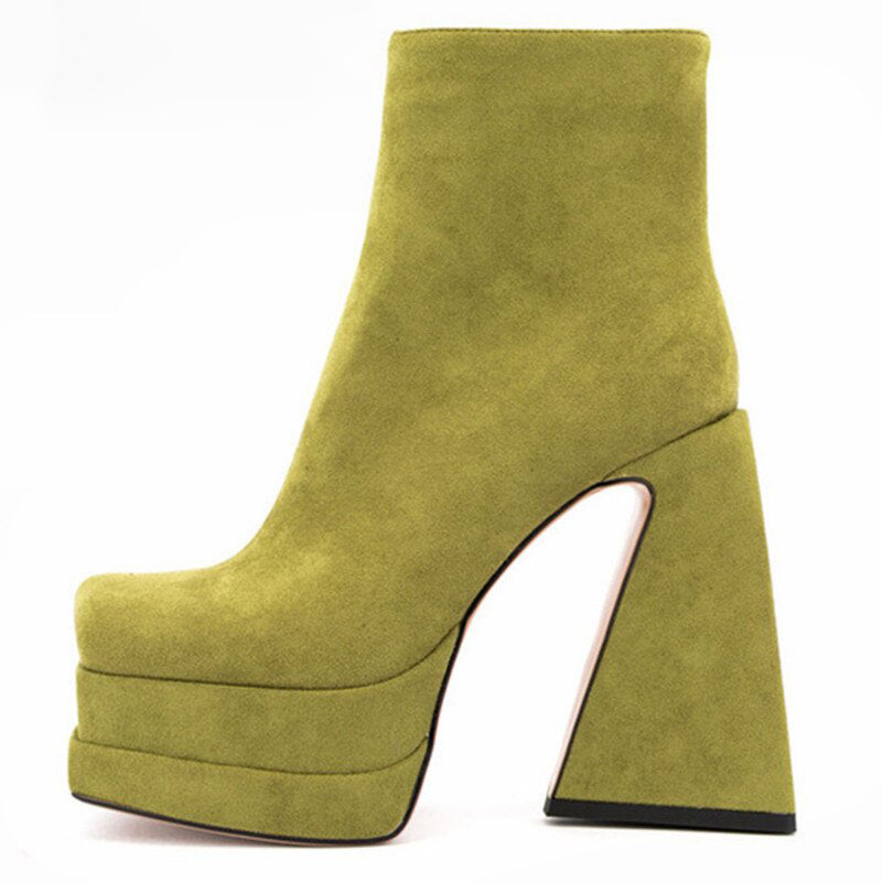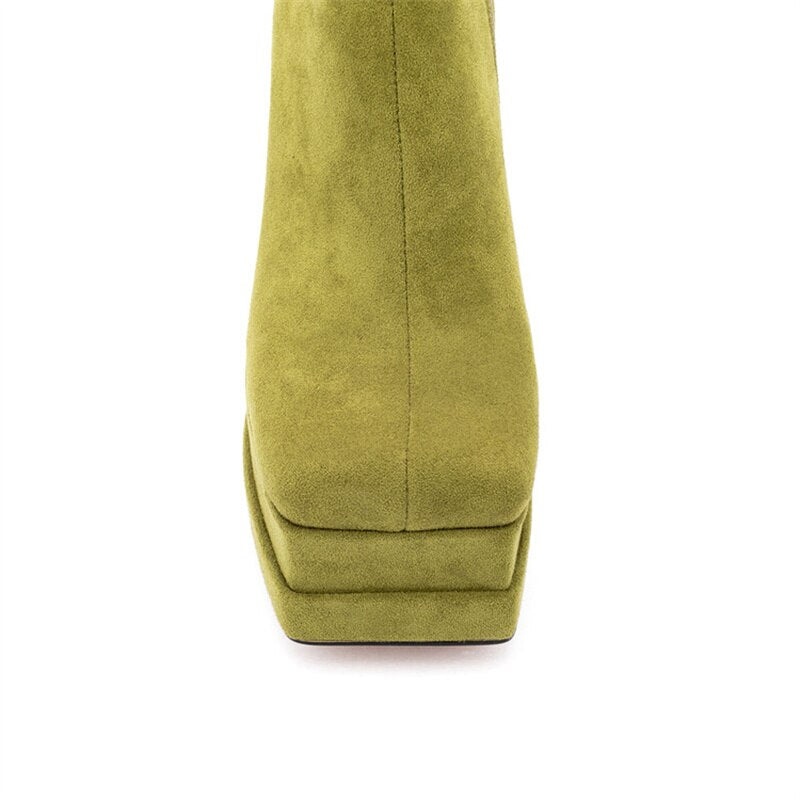 These platform boots feature a stylish chunky square toe and a wedge heel crafted from durable rubber sole and soft suede upper material. Designed for outdoor wear, they include a convenient side zipper closure and are lined with artificial short plush for added comfort. The boots extend over the knee, combining fashion with functionality, making them a versatile addition to your wardrobe.
