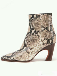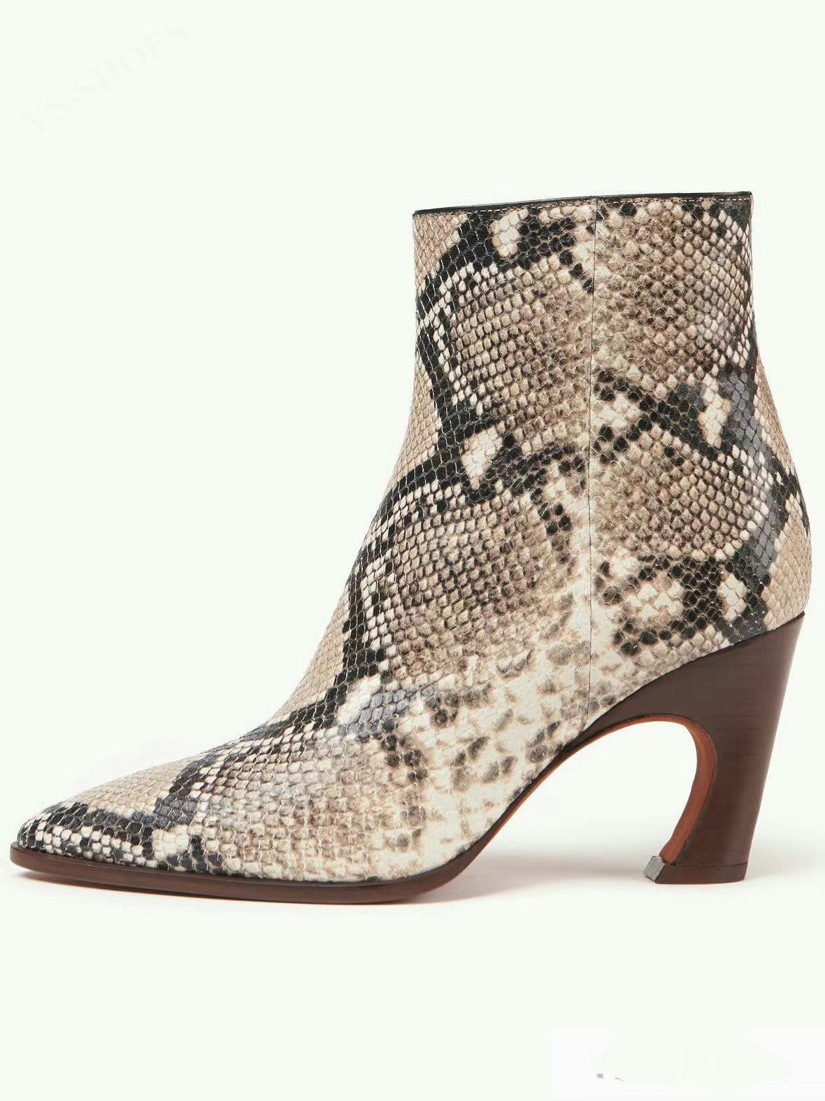 These pointed-toe ankle boots combine style and comfort with a high, thick heel measuring 6-8 cm, perfect for elevating your look while ensuring stability. Crafted from soft microfiber leather with a sleek, solid color design, they feature a convenient side zipper for easy wear. Inside, the boots are lined with ultrafine fibre and microfiber insole materials for warmth and softness. Available in black, apricot, and snake patterns, these fashionable boots incorporate metal accents for added flair, making them a versatile choice for both casual and dressy occasions.
