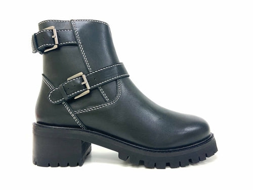 Sturdy leather ankle bootie with a 2" block heel and slip-resistant sole. Features side zippers for easy wear, cushioned footbed, and belt buckle details. Perfect for all-day comfort and stability.