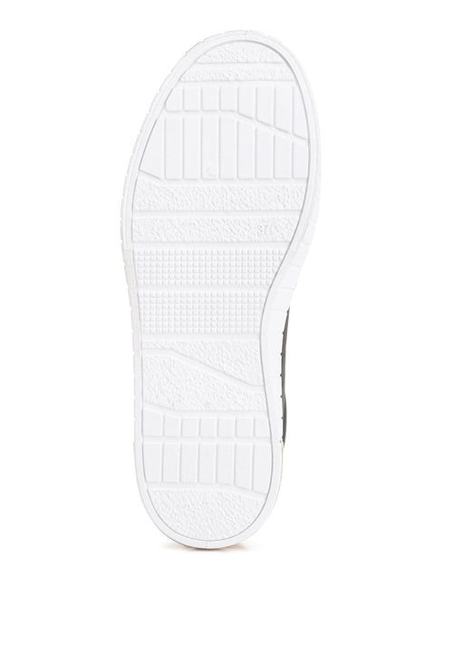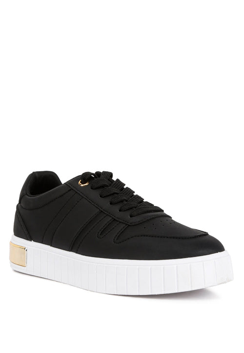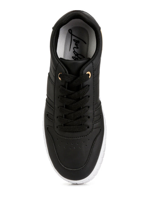 Welsh Panelling Detail Sneakers combine style with everyday comfort. The flatform sole delivers a subtle lift and stable foundation, while gold metallic eyelets add visual interest. Crafted with a PU upper, cushioned insoles, and TPR sole, these lace-up sneakers feature panelling detail and a rounded toe for a polished look.