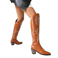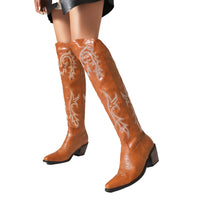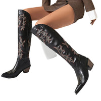 These Western Cowboy Boots for women combine classic style with modern flair. Crafted from durable microfiber, the upper ensures a comfortable fit while maintaining sleek aesthetics. The rubber sole offers excellent grip and long-lasting wear. Designed with a pointed toe and a sturdy chunky high heel, these over-the-knee cowgirl boots add a bold, confident touch to any outfit. Perfect for standing out at events or everyday wear, they blend fashion with function in a versatile, eye-catching design. Available in various sizes to provide a tailored fit.